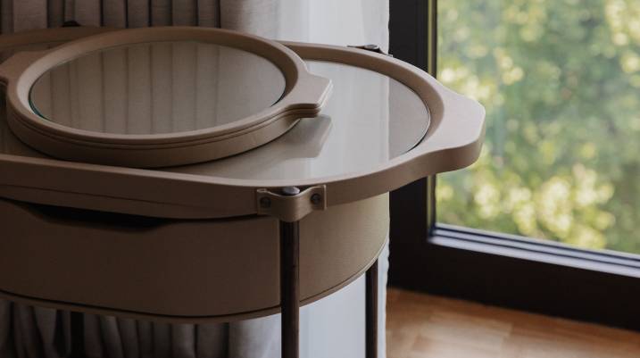 Layered with a mirror inset into the removable tray with complimentary handles. This feature makes it easy to move around when serving drinks and lockable wheels ensure stability.