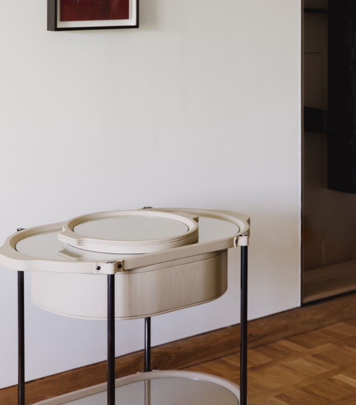 The result is an artfully designed two-tiered bar cart trolley with leather finishing, inspired by the feminine architectural lines used within the room echoing the curved cornice detail to add characterful surprised and warmth to the interiors.