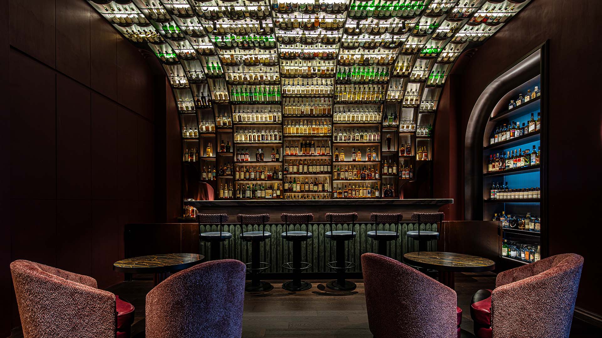 Tucked away like a secret library of spirits, OBE is the club’s whisky bar located on the third floor. Named after the “Old Bottle Effect”, a term referring to the complex character that evolves in aged whiskies. Designed as an intimate and enveloping refuge, OBE is anchored by a curved, custom-built floor-to-ceiling cabinet clad in lustrous anodised black metal, housing an extensive collection with a focus on rare Japanese labels. The ambience is low-lit and contemplative, with soft wall sconces, table lamps and plush black leather banquettes creating a cocoon of calm sophistication where one can sip and savour undisturbed.