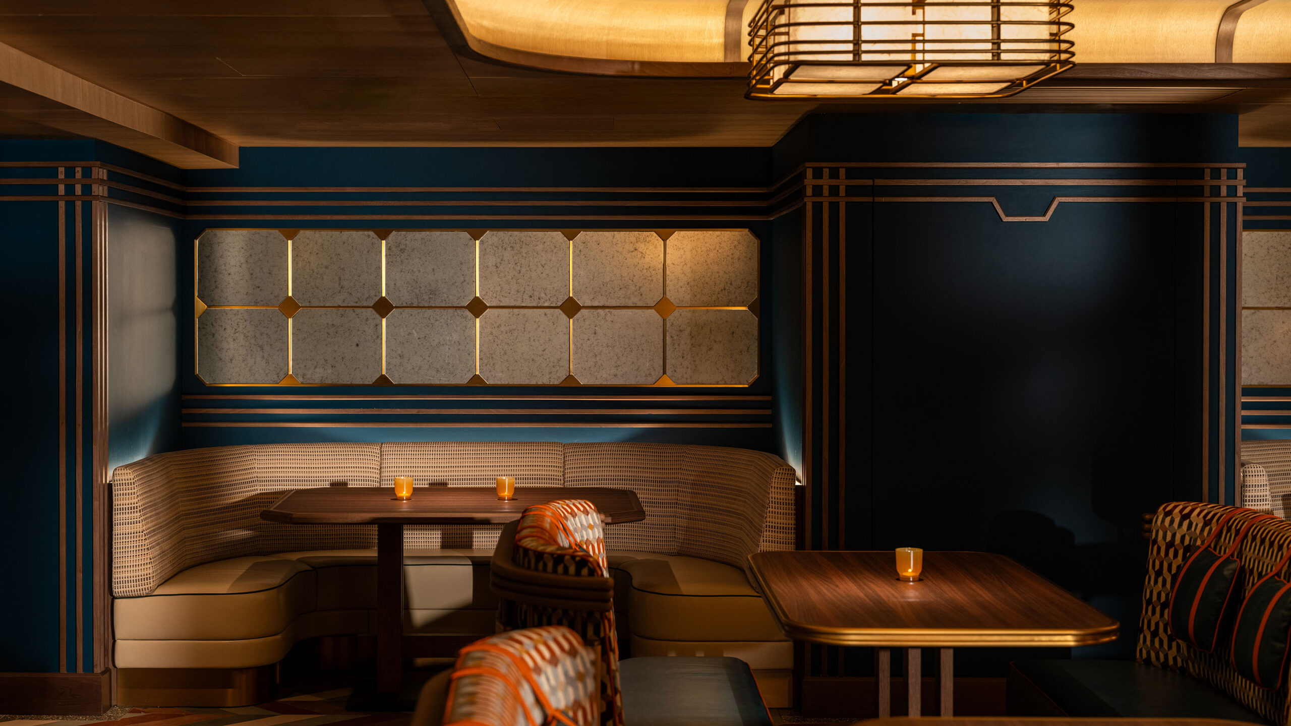 The space is brought to life by a dizzying dream-like palette of teal and aqua, set alongside bold orange and peach tones. Warm timber finishes, bold patterned upholstery and mid-century geometric details define the scheme, while dramatic ceilings are enhanced by a rhythmic array of lanterns and the neon floating islands, referencing the graphic nature of neon street signage. Intricate ceramic tiles wrapping the columns allude to building facades, further shaping the immersive aesthetic of the cityscape.
