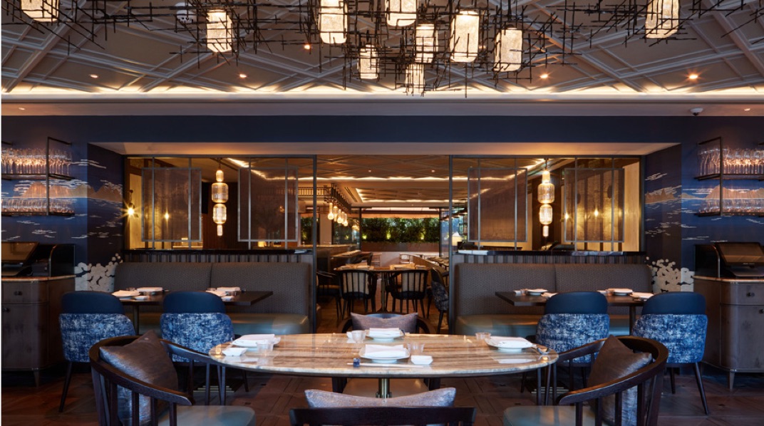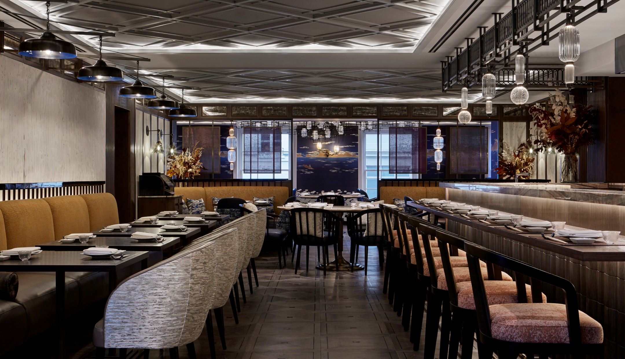 The main dining area features a panoramic hand-painted scenery of Japanese fishermen on the Nagara River flooded with mint lily pads, forming the backdrop to our dining scene. The main dining sculptural chandelier is composed of iron strokes representative of Japanese calligraphy and suspended glass blocks; casting fluid beams of light onto our colonial linen ceilings.