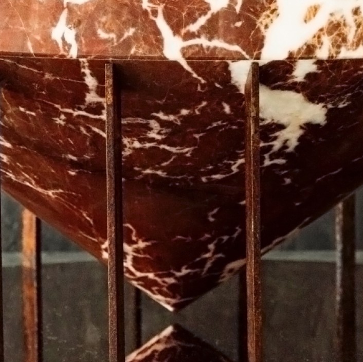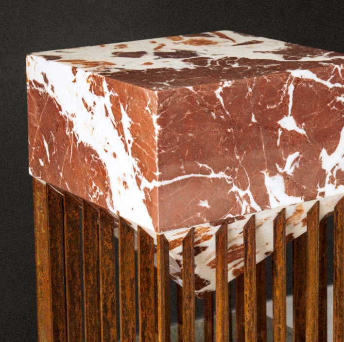 大理石镶嵌在由耐候钢制成的钢爪底座上,其抛光饰面展现了高超的工艺。我们通过模仿宝石的镶嵌手法,展现大理石的稀缺性,同时突出设计细节的奇妙艺术。