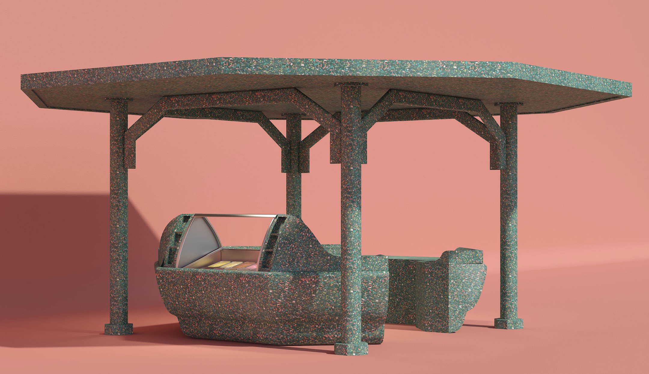 由水磨石制成的八角形冰淇淋亭。湖水绿、珊瑚和黄色的用色,灵感源自香港旧唐楼的楼梯;配合独特的结构和选材,项目散发出一股旧城市的魅力。